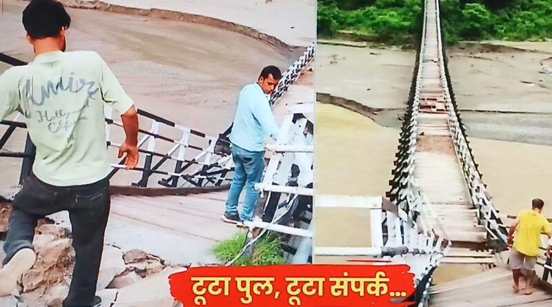 बारिश से क्षतिग्रस्त हुआ फुट ब्रिज, जान हथेली पर रख टूटे पुल से खड्ड लांघ रहे ग्रामीण
