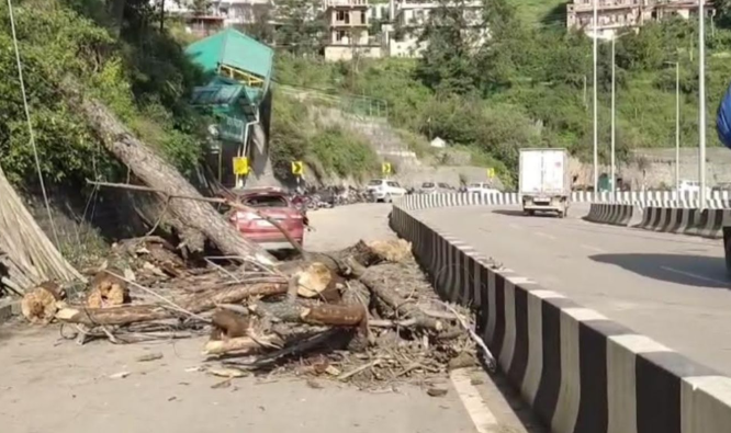 सोलन में NH-5 पर गिरा चीड़ का पेड़, तीन कारें क्षतिग्रस्त
